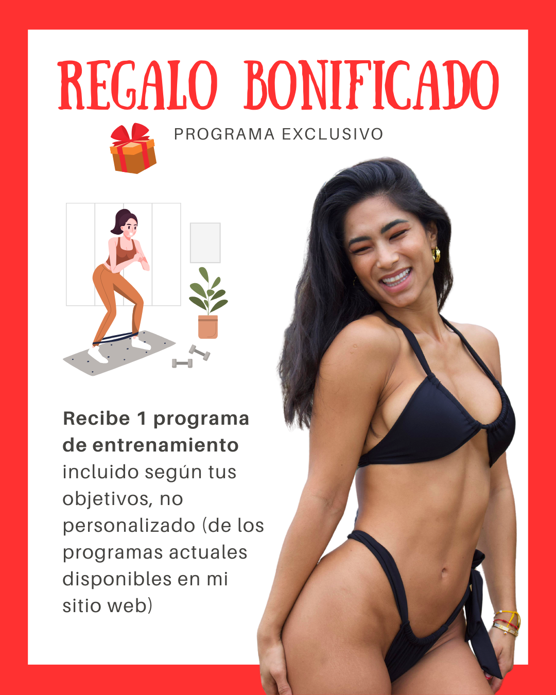 🎁💪🏽 Regalo Bonificado: Recibe 1 programa de entrenamiento incluido según tus objetivos, no personalizado (de los programas actuales disponibles en mi sitio web).