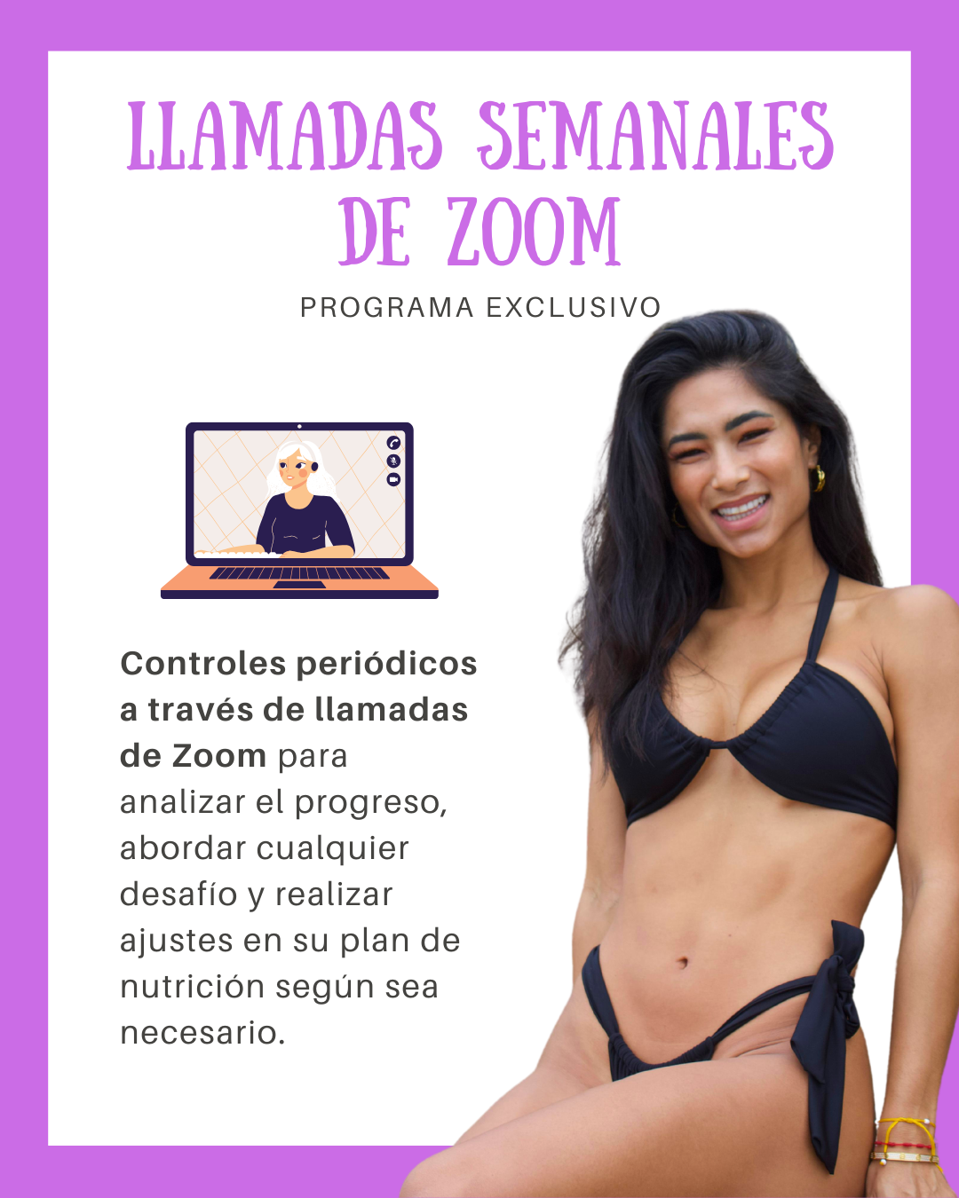 🎥 Llamadas semanales de Zoom: Controles periódicos a través de llamadas de Zoom para analizar el progreso, abordar cualquier desafío y realizar ajustes en su plan de nutrición según sea necesario.