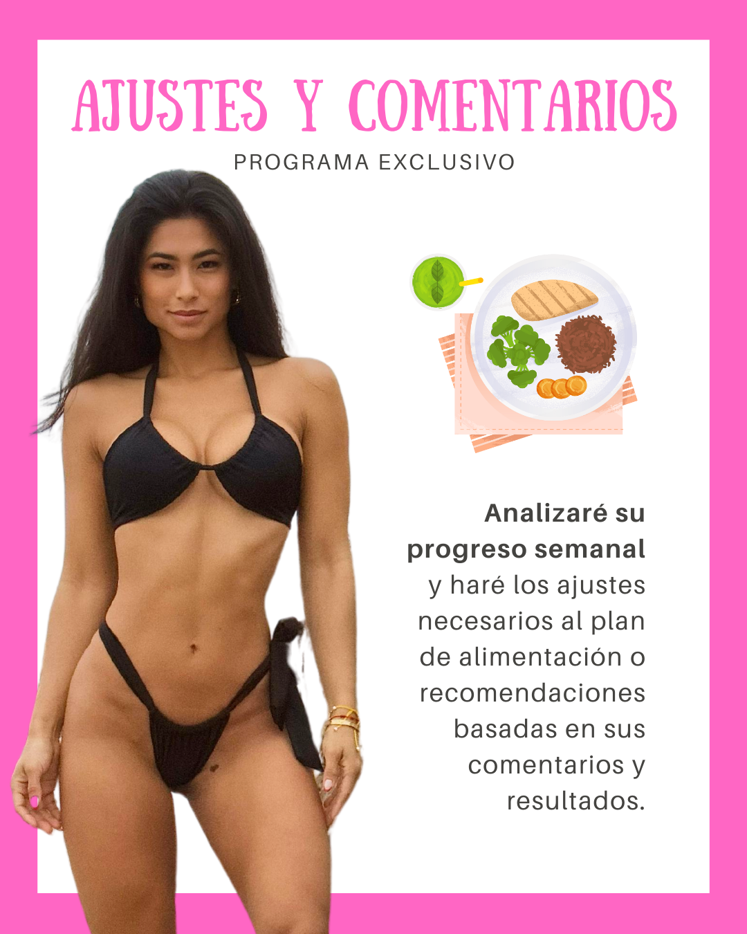 📝 Ajustes y comentarios: Analizaré su progreso semanal y haré los ajustes necesarios al plan de alimentación o recomendaciones basadas en sus comentarios y resultados.
